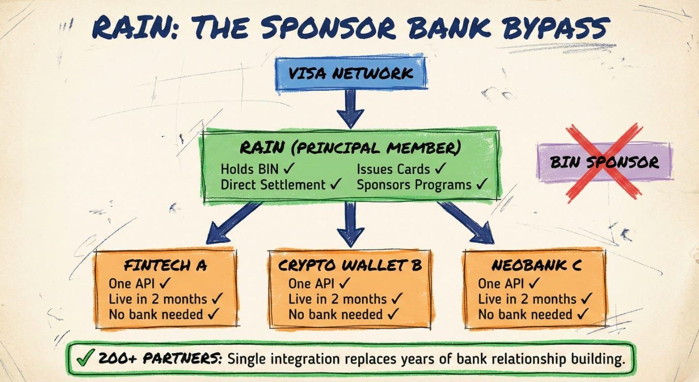 How Rain became a Visa Principal Member, a status usually held by banks and a small set of highly regulated payments institutions, and turned that into a $1.95B platform that lets any fintech issue stablecoin-powered cards without a single banking relationship.